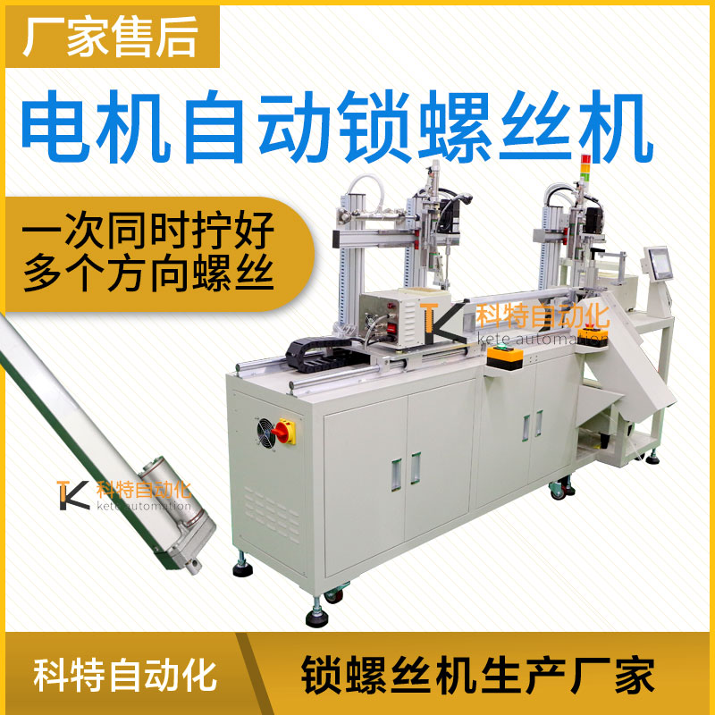 本案例主要為電機設計自動鎖螺絲機,電機型號有很多,其主要作用是產生驅動轉矩,作為用電器或各種機械的動力源,產品長桿電機驅動,在裝配加工擰螺絲工序中要求非常高,電機機芯上的2顆螺絲自動擰緊和電機的尾端一顆螺絲自動擰緊,廠家要求產品要同時鎖付好所有的螺絲,而且扭力矩精確到位,為此科特自動化根據產品結構以及廠家的生產要求進行設計水平橫向自動鎖螺絲機。